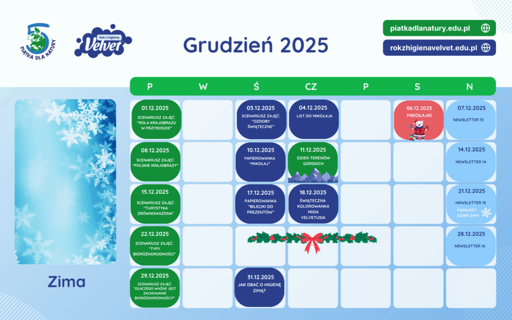 Grudzień w naszym programie upłynie pod znakiem świątecznych aktywności z misiem Velvetusiem! Przygotowaliśmy mnóstwo kreatywnych i zabawnych zajęć dla dzieci:
